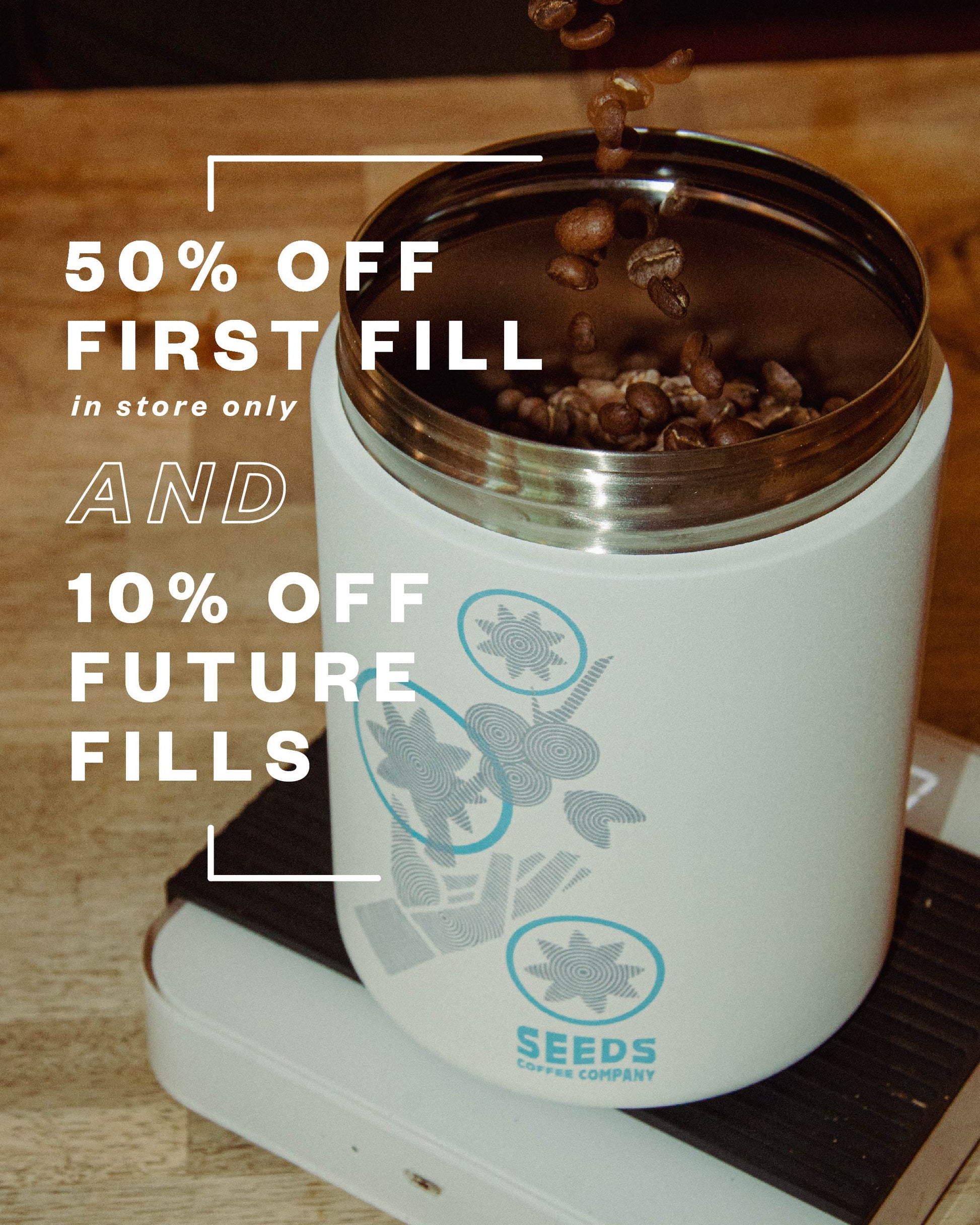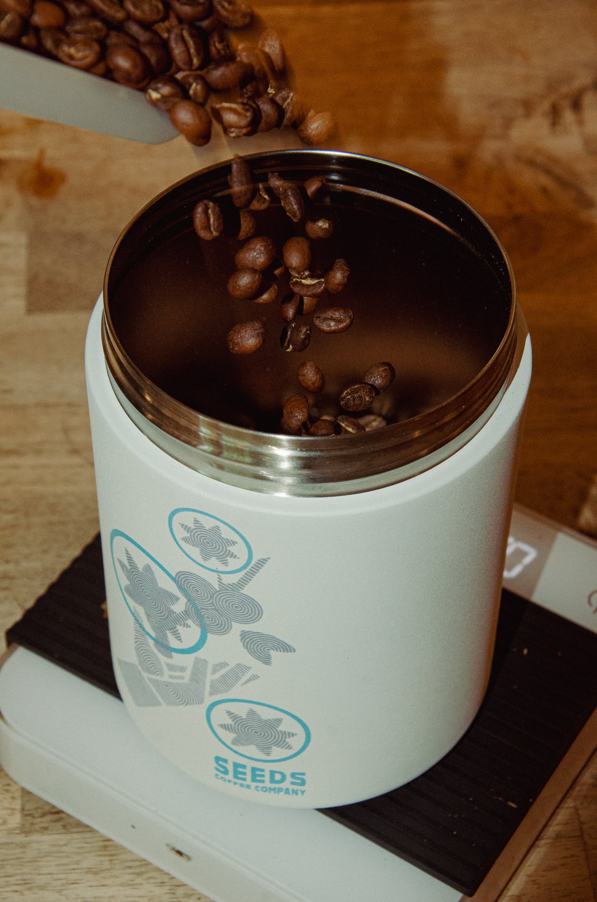 The Seeds Coffee canister keeps your coffee beans fresh. Plus, you can save 10% when you bring in your Seeds container into our shop and get one of our package-less coffee offerings.